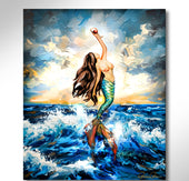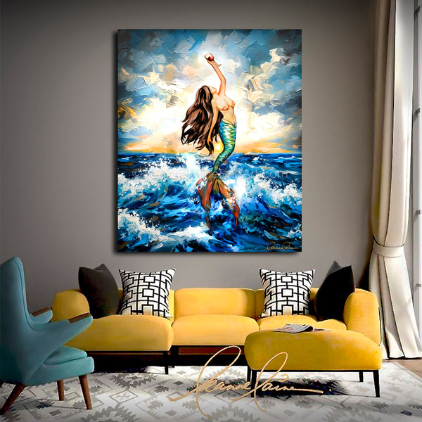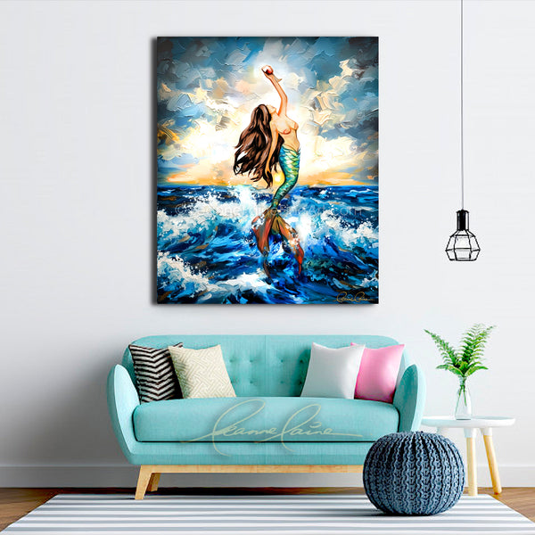 Though the ocean is deep, she was born for the rise, to toast the healing glow of the sun kissed skies. With Merlot in hand and the spray in her wake, she honors the strength that no current can break. - A fearless mermaid soars above the turbulent sea in Mermaid's Merlot. With glass held high in a gesture of pure confidence and power, she embodies the spirit of someone who dares to rise above, celebrate boldly, and claim her moment. With every splash and surge, she commands the ocean itself. A beautiful soul who refuses to blend in and lives life on her own terms. A testament to courage, sophistication, and untamed freedom.  Rise triumphantly above turbulent seas, wine glass held high in a powerful gesture of celebration and strength. Perfect for those who embrace boldness, sophistication, and living authentically, this piece transforms any space with its dynamic energy and inspiring message. Ideal for art lovers, coastal décor enthusiasts, and anyone seeking meaningful wall art that speaks to courage and self-empowerment. A beautiful reminder that true strength lies in refusing to blend in and claiming your moment.