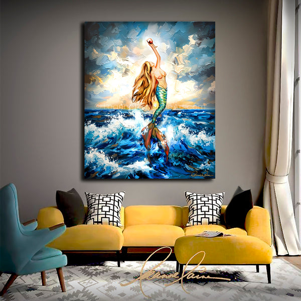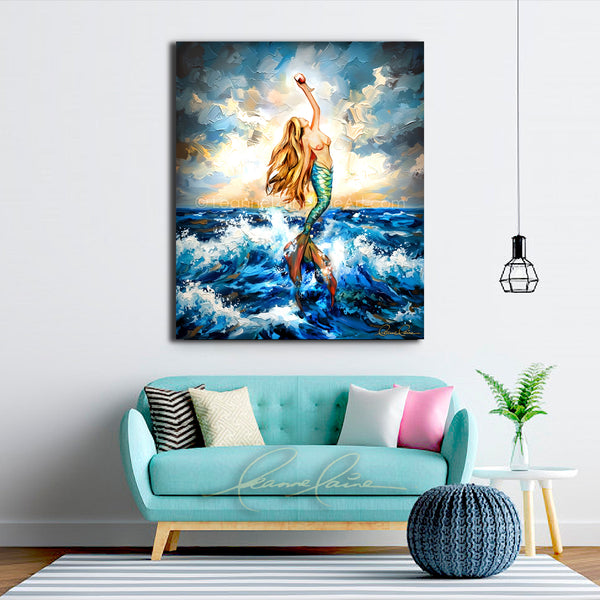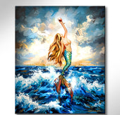 Though the ocean is deep, she was born for the rise, to toast the healing glow of the sun kissed skies. With Merlot in hand and the spray in her wake, she honors the strength that no current can break. - A fearless mermaid soars above the turbulent sea in Mermaid's Merlot. With glass held high in a gesture of pure confidence and power, she embodies the spirit of someone who dares to rise above, celebrate boldly, and claim her moment. With every splash and surge, she commands the ocean itself. A beautiful soul who refuses to blend in and lives life on her own terms. A testament to courage, sophistication, and untamed freedom.