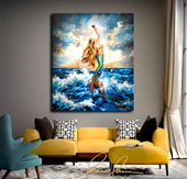 Painting of a mermaid in a dynamic pose with wine in hand on a colorful ocean background Mermaid and wine artwork on a wall in a modern living room